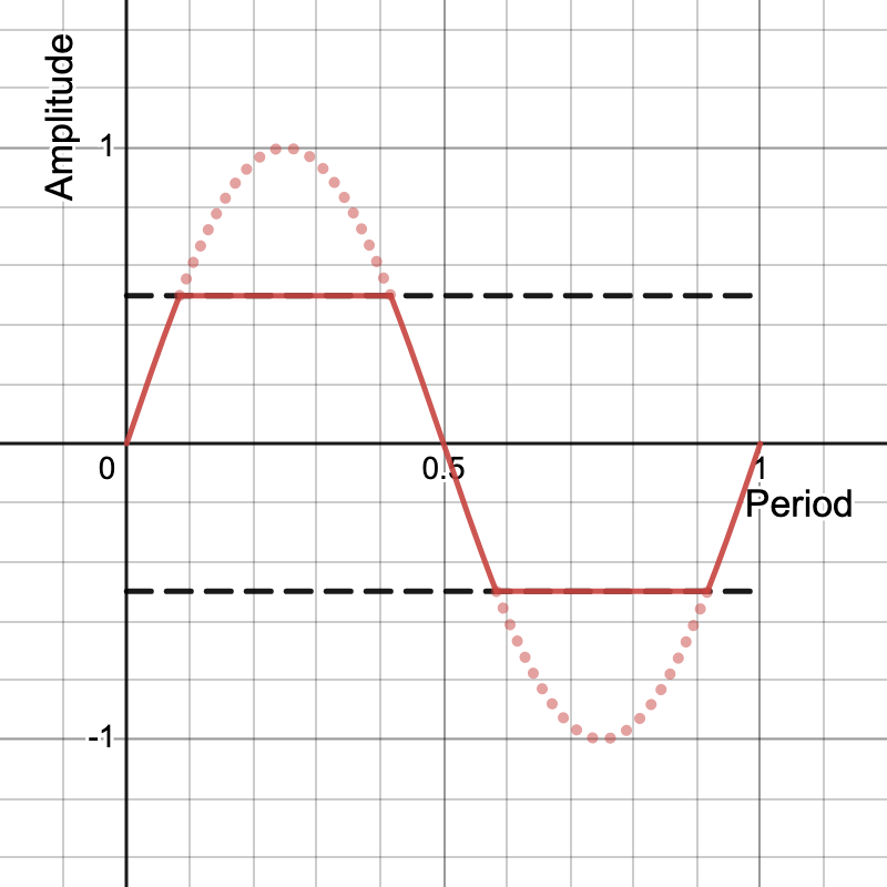 The most basic example is a limiter. A limiter stops an input signal from exceeding a configurable threshold. If we’re dealing with an audio signal that exists between -1 and +1, if we apply a limiter with the threshold set to -0.5, and 0.5, then the input signal would be clipped at -0.5, and 0.5 despite needing to travel lower and higher in amplitude. Additionally, this would be called a hard limiter, since there is no complexity at the point of cutoff—we shift drastically from reproducing the input signal to limiting at -0.5, and 0.5. Here’s what that looks like visually for one period of a sine wave.